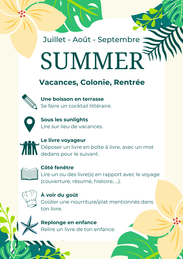 L’été, c’est aussi la période des vacances. Offre toi un cocktail, ose tester de nouvelles saveurs et partage un de tes lectures via les boîtes à livres.