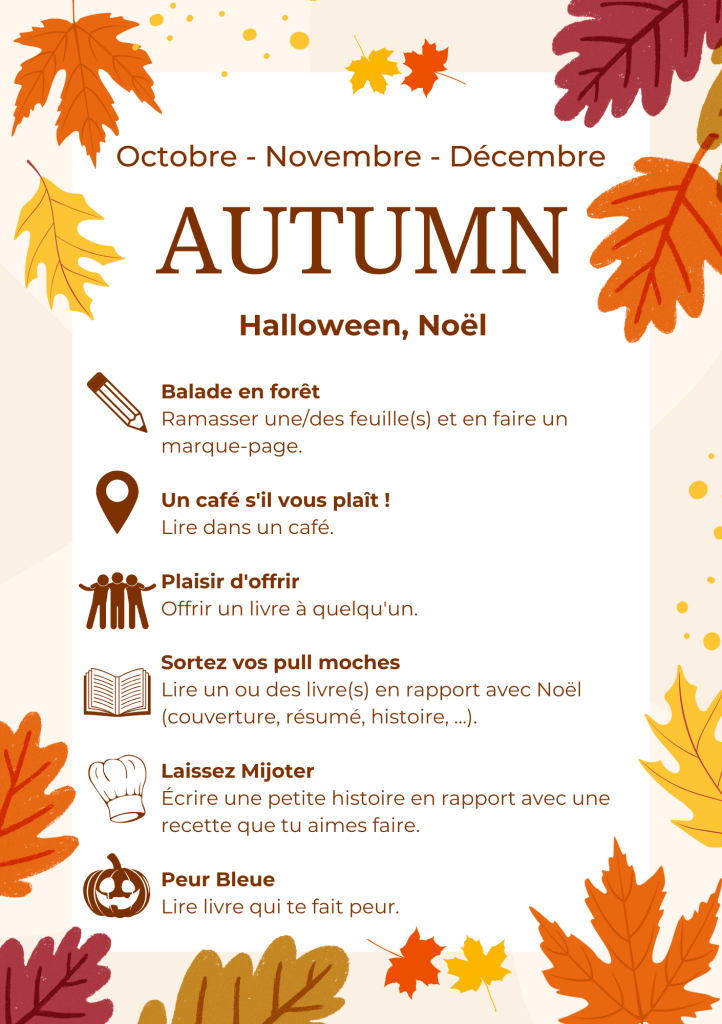 C’est la dernière ligne droite ! Les feuilles tombent, profites-en pour les ramasser et en faire un beau marque-page et régale-toi d’une délicieuse boisson chaude. Et oui, les températures baissent et les citrouilles sont de sortis et les créatures fantastiques aussi. Fais-toi peur en lisant un livre d’horreur.